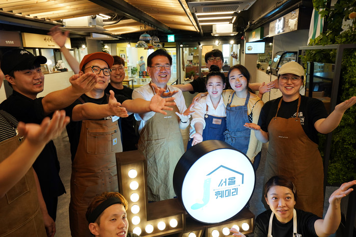 | ▲ 경동시장 청년몰 '서울훼미리'에서 유덕열 구청장과 청년 상인들이 기념촬영을 하고 있다. (사진제공=동대문구청) |