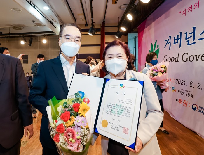| ▲ 거버넌스지방정치대상을 수상한 수 기념촬영을 하고 있는 황 의장(오른쪽). (사진제공=강동구의회) |