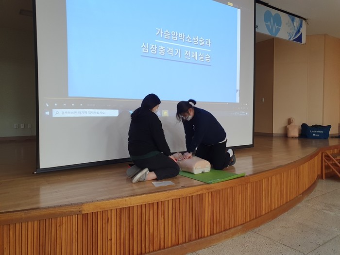 이날은 경상대학교병원 전문의와 응급구조사 및 간호사의 지도 아래 심폐소생술 및 응급처치에 대한 이론 교육과 실습, 자동심장충격기 사용법 등 실습 위주의 교육을 진행했다.