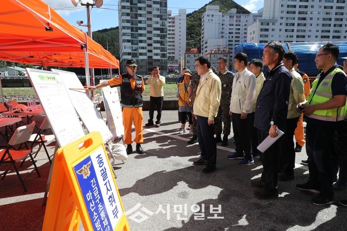 [창원=안기한 기자] 허성무 창원시장은 지난 2일 밤부터 3일 사이 집중호우를 동반한 제18호 태풍 ‘미탁’으로 피해를 입은 북면 신리저수지 배수로 제방 피해지역과 월영동 해안도로 침수지역 등을 3일 긴급 점검했다.