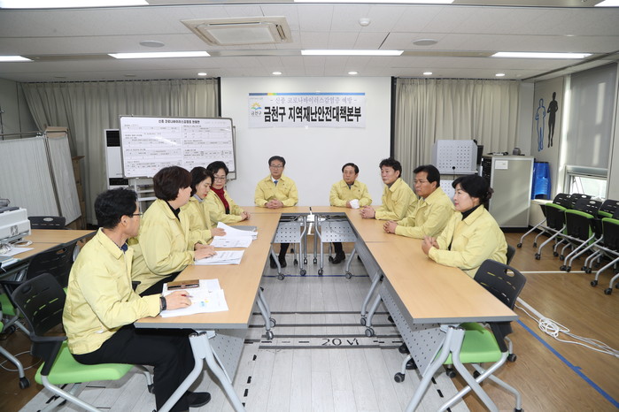 | ▲ 금천구 지역재난안전대책본부를 방문한 금천구의원들이 관계자들에게 현재 상황에 대한 이야기를 듣고 있다. (사진제공=금천구청) |