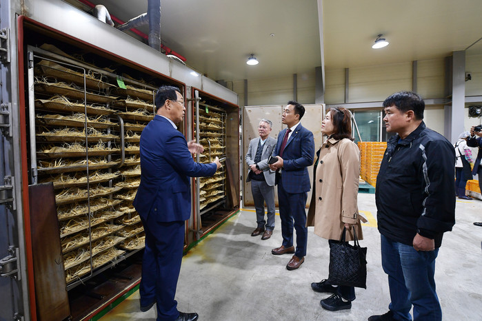 ▲ 김포파주인삼농협유통센터 가공시설을 방문한 도시환경위원들이 관계자의 설명을 들으며 시설을 둘러보고 있다. (사진제공=김포시의회) |