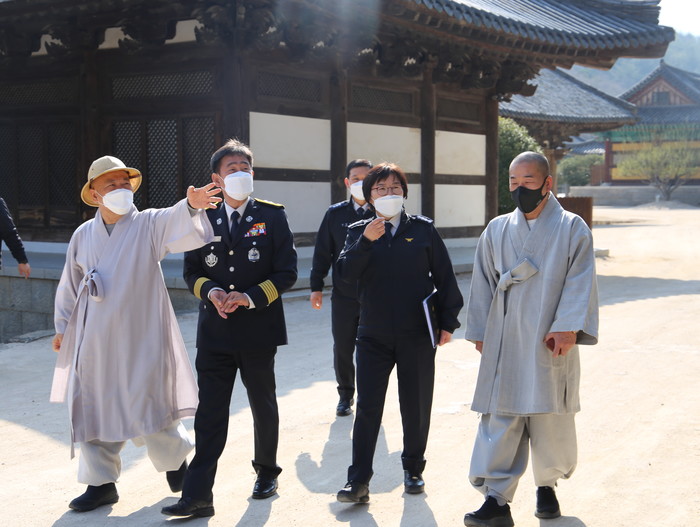| ▲ 김조일 소방본부장이 통도사 경내 현지 확인하는 모습 |