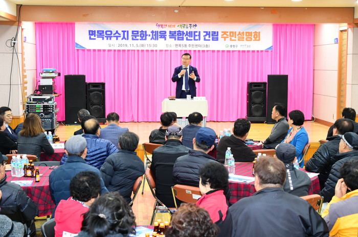 | ▲ 면목유수지 문화·체육 복합센터 건립 주민설명회에 참석한 류경기 구청장이 주차장 확충, 녹지 조성등을 내용으로 하는 ‘면목유수지 환경개선 추진사업’에 대해 설명하고 있다. |