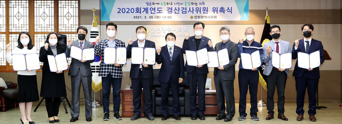 [인천=문찬식 기자] 인천시의회가 최근 의장 접견실에서 ‘2020회계연도 결산검사위원’위촉식을 열고, 민경서·이병래·서정호 의원을 비롯해 세무사 5명, 재무 전문가 2명 등 총 10명을 위촉했다.