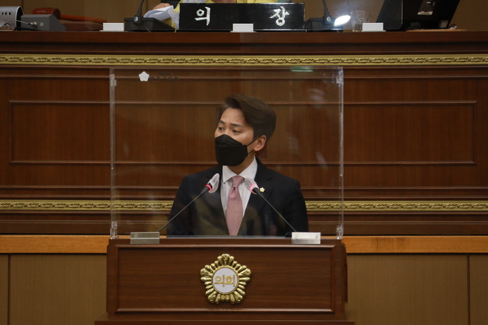 | ▲ 제248회 임시회 제1차 본회의에서 이민석 의원이 경의선 숲길 공원 1단계 구간의 연결성 보완 및 환경 개선에 대해 발언을 하고 있다. (사진제공=마포구의회) |