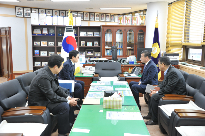 | ▲ 현안을 논의하고 있는 신상균 의장과, 이화섭 경찰서장. (사진제공=양천구의회) |