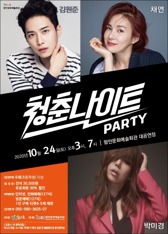 오는 10월 24일(토) 오후 3시, 7시 함안문화예술회관 대공연장에서 옛 추억을 소환하는 흥겨운 콘서트 ‘청춘 나이트 PARTY’ 공연이 무대에 오른다.