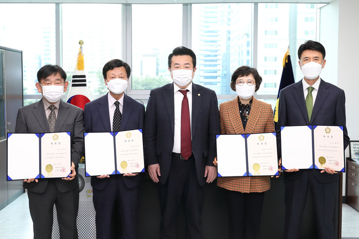 | ▲ 박동웅 의장(가운데)이 결산검사위원을 위촉하고 기념촬영을 하고 있다. (사진제공=구로구의회) |