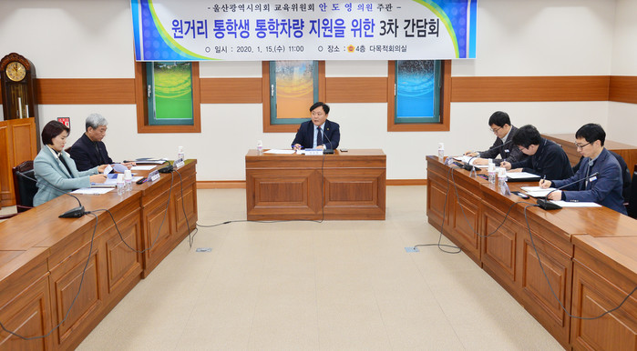 [울산=최성일 기자] 울산시의회 안도영 운영위원장은 15일 시의회 4층 다목적회의실에서 시청, 교육청 담당자들과 함께 원거리 통학생 통학차량 지원을 위한 3차 간담회를 개최했다.