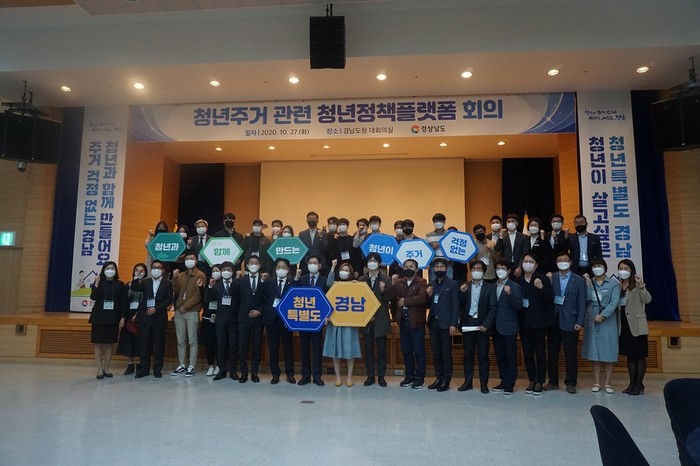 | ▲ 지난해 열린 청년주거 관련 청년정책플랫폼 회의 참석자들이 기념촬영을 하고 있다. (사진제공=경남도청) |