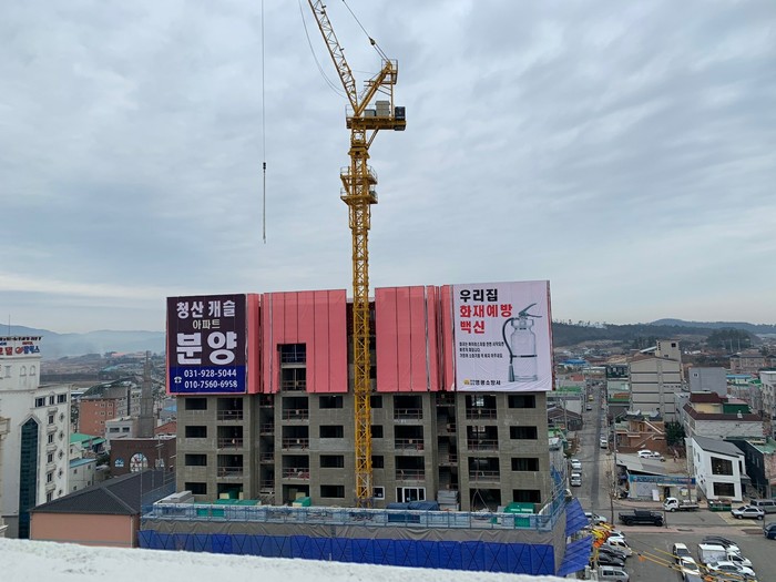 청산캐슬 공사 현장의 가림막에는 주택용 소방시설 설치 홍보 내용이 들어있다.