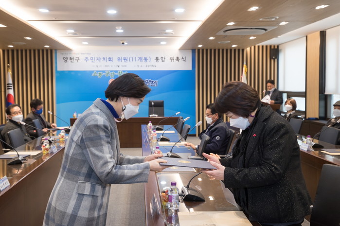 서울 양천구는 최근 주민 스스로 마을의 현안 문제를 발굴·해결하기 위해 자치계획을 수립하고 실행하는 지역사회의 주민 대표기구인 '주민자치회 위원 통합 위촉식'을 개최했다. 사진은 위촉식에서 김수영 구청장(왼쪽)이 주민자치회 위원에게 위촉장을 수여하는 모습. (사진제공=양천구청)