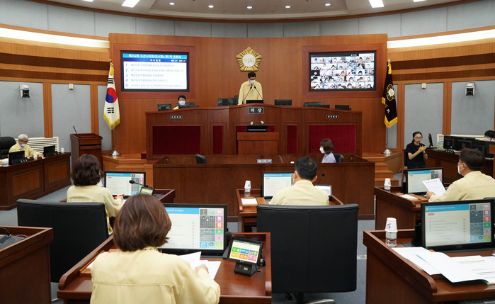 장인수 의장은 개회사를 통해 “엄중한 시기에 임시회를 개최하게 돼 우려스럽지만, 시민을 위해 꼭 필요한 예산과 조례를 처리하기 위한 회기로, 집행부 실·과장들은 이 자리에 참여하지 않고 화면으로 참여하는 전국 최초의 온택트 임시회를 개최하게 됐다”며 “지금의 어려움은 시민여러분의 도움이 없다면 코로나19를 이겨낼 수 없기에 시민여러분들께서 조금만 더 힘을 내서 방역에 적극 협조해 주시기 바란다”고 말했다.