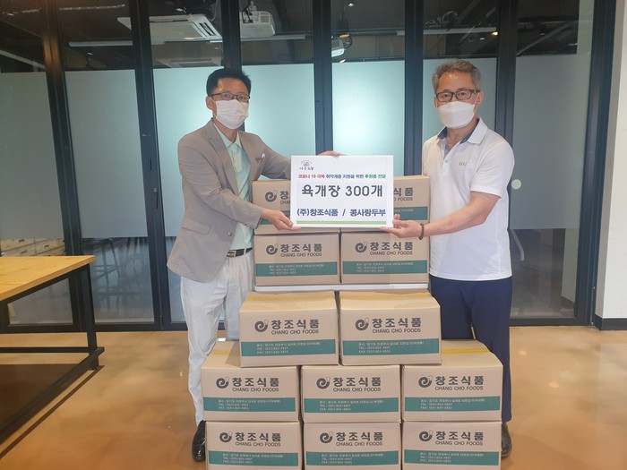 서울 도봉구 방학1동은 최근 (주)창조식품으로부터 코로나19로 인해 어려움을 겪고 있는 취약계층을 위한 냉동 육개장 300개를 후원받았다. 사진은 전달식에서 관계자들이 기념촬영을 하고 있는 모습. (사진제공=도봉구청)