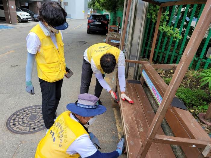 경기 광주시 행복마을관리소가 최근 취약계층 집수리 후 남은 자재와 버려진 재활용 목재를 활용해 경안동 주거지역과 상가중심지를 이어주는 도로에 위치한 벤치를 수리했다. 사진은 행복마을관리소에서 도로변 벤치를 수리하고 있는 모습. (사진제공=광주시청)