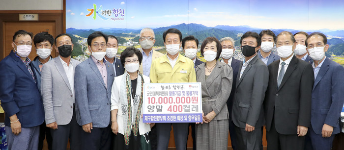 지난 16일 합천군을 방문한 조경환 재구향우회장과 지정도 재외합천향우연합회장 등 향우 일동은 1천만원의 성금과 양말 400켤레를 기탁했다.