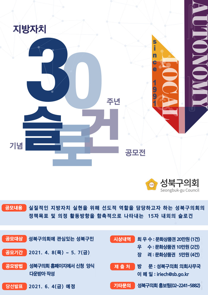[시민일보 = 홍덕표 기자] 서울 성북구의회(의장 김일영)가 지방자치법 전부개정 및 지방자치 부활 30주년을 기념해 8일부터 오는 5월7일까지 약 한 달간 '슬로건 공모전'을 개최한다.