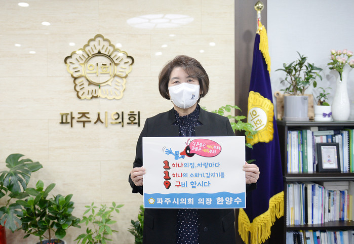 한양수 의장은 “화재로 인한 상처는 회복이 어려운 만큼 시민 모두 화재 예방에 큰 관심을 기울여 주시기 바란다”며 “이번 캠페인을 통해 파주시민, 특히 취약계층 각 가정에 주택용 소화기와 감지기가 꼭 구비될 수 있도록 집행부의 집중 관리를 부탁드린다”고 당부했다.
