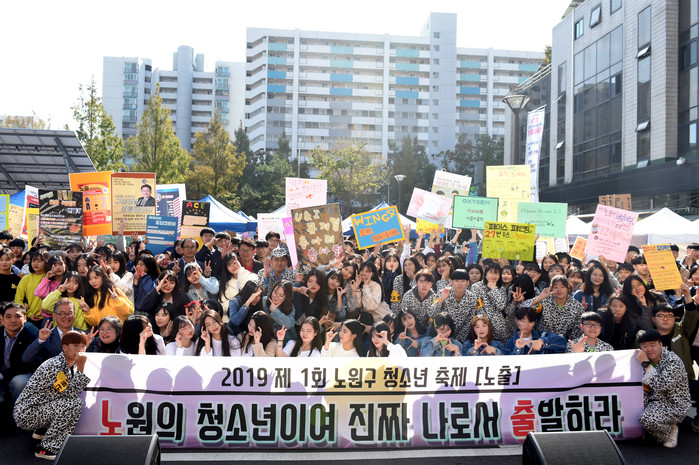 | ▲ 지난 10월26일 개최된 청소년 축제 ‘노출’에 참여한 청소년들이 기념촬영을 하고 있다. (사진제공=노원구청) |