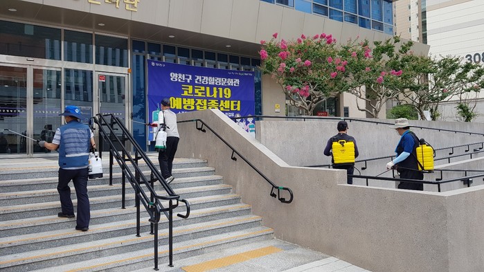 서울 양천구 신월6동 마을사랑방역봉사단이 최근 아파트놀이터·버스정류장·공공시설 주변 등을 소독했다. 구는 각 동 마을사랑방역봉사단이 주 3회 코로나19 예방 방역활동을 하고 있다. 사진은 봉사단이 방역을 하고 있는 모습. (사진제공=양천구청)