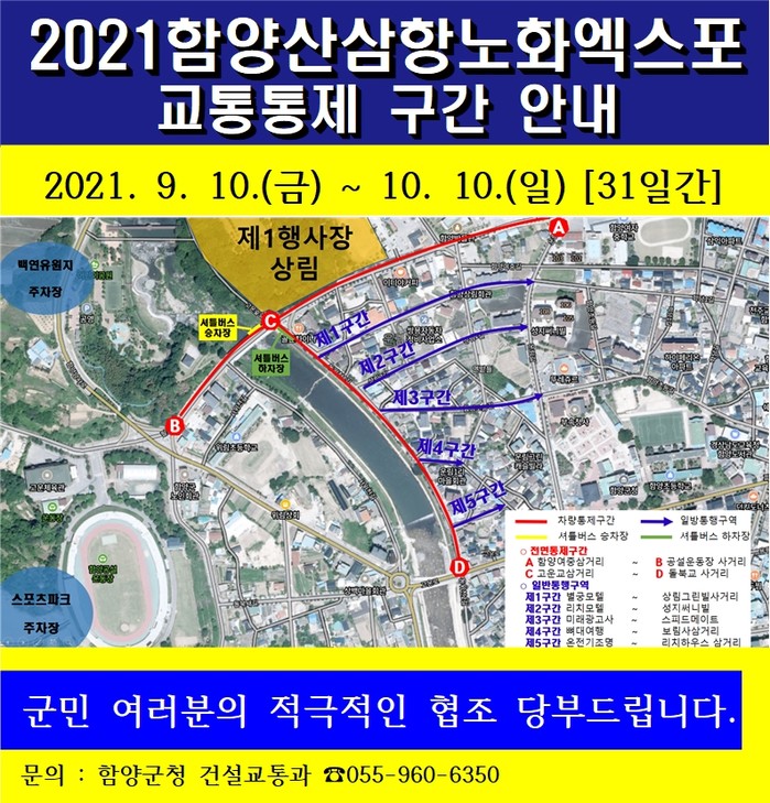 함양군은 2021 함양산삼항노화엑스포 기간 원활한 엑스포 진행을 위해 상림공원 제1행사장 주변 도로에 대한 전면통제와 이면도로 일방통행을 실시하기로 하였다.