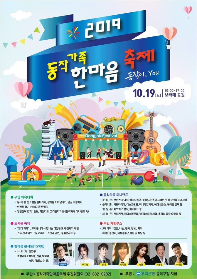 [시민일보 = 여영준 기자] 서울 동작구(구청장 이창우)가 오는 19일 오전 10시~오후 5시 보라매공원에서 ‘2019 동작가족 한마음축제’를 개최한다고 밝혔다.