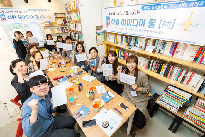 | ▲ 지난해 9월 서울혁신파크 한평책빵에서 열린 독서토론회 '직원 아이디어 通'에 참석해 직원들과 함께 포즈를 취하고 있는 김미경 구청장(오른쪽 세번째). |