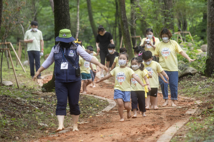 | ▲ 구미시 산림휴양시설에서 어린이들이 맨발로 걷고 있다. (사진제공=구미시청) |