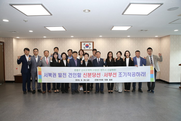 25일 구의회에 따르면 만장일치로 채택된 결의안은 이연옥 의장이 대표발의한 것으로, 48만 은평구민의 교통편의 향상과 지역 발전을 위해 ▲신분당선 서북부 연장구간과 ▲서부선의 조속한 착공 ▲고양선 신사고개역 신설을 강력히 요구하는 내용이 담겨 있다.