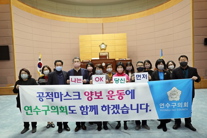 인천 연수구의회는 최근 코로나19 확산과 마스크 수급 불균형에 대응하기 위한 ‘나는 OK, 당신 먼저 캠페인’에 동참하기로 했다. 사진은 공적마스크 양보 필요성에 공감한 의원들이 캠페인에 참여해 공적마스크 구매 자제를 홍보하는 모습. (사진제공=인천 연수구의회)