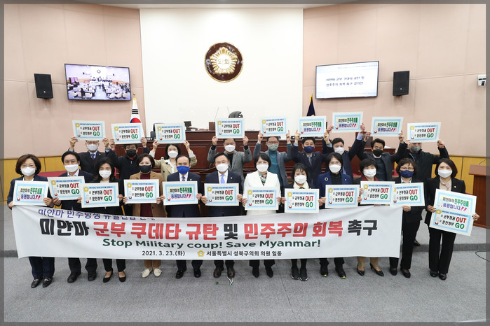 | ▲ 23일 제281회 임시회 제1차 본회의에서 '마얀마 군부 쿠데타 규탄 및 민주주의 회복 촉구 결의안'을 채택한 후 김일영 의장(앞줄 왼쪽 여섯 번째)과 구의회 의원들이 피켓을 들고 미얀마 군부 쿠데타 규탄 및 민주주의 회복을 촉구하고 있는 모습. (사진제공=성북구의회) |