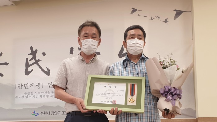 경기 수원시 장안구 조원1동은 최근 모범시민으로 선정된 목명균 주민자치위원에게 수원시장 표창장을 전수했다. 목 위원은 조원1동 주민자치위원으로 활동하며, 지역에 대한 애정으로 주민자치센터 활성화를 위해 노력했으며 지속적인 봉사활동으로 지역사회의 발전에 기여한 공을 인정받아 표창장을 받았다. 사진은 목 위원이 표창장을 전달받고 기념촬영을 하는 모습. (사진제공=장안구청)