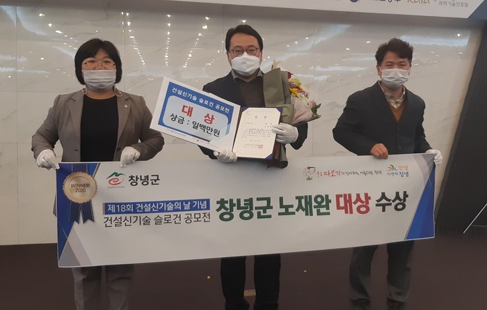 최근 개최된 제18회 건설신기술의 날 기념식에서 창녕군 고암면 노재완 주무관이 슬로건 공모 부문 대상을 수상했다.