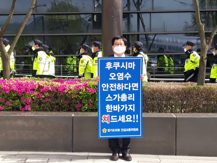 [수원=채종수 기자] 조광희 경기도의회 건설교통위원(더불어민주당, 안양5)이 최근 일본대사관 앞에서 후쿠시마 방사능 오염수 방류 결정을 비판하며 1인시위을 실시했다.