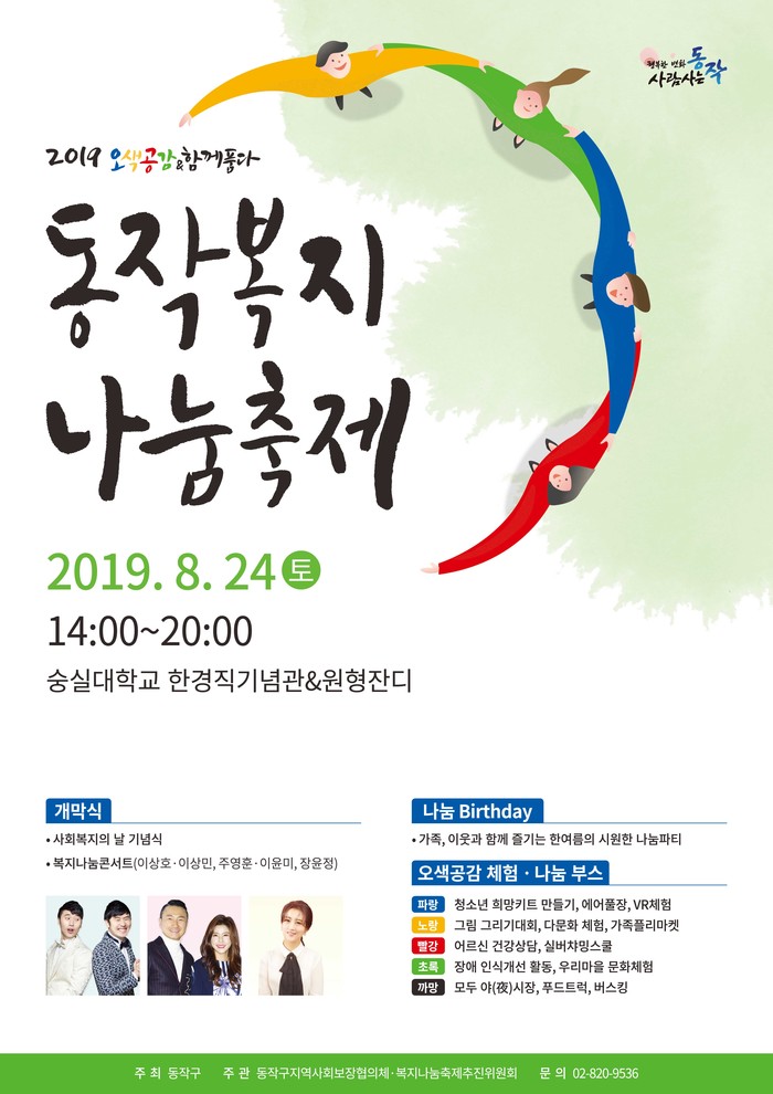 [시민일보 = 여영준 기자] 서울 동작구(구청장 이창우)가 오는 24일 오후 2~8시 숭실대학교에서 2019 동작복지나눔축제 ‘오색공감&함께품다’를 개최한다.