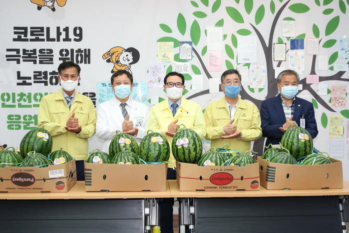 인천시의회가 최근 인천시의료원과 인천시보건환경연구원을 방문, 코로나19 최일선 현장에서 최선을 다하고 있는 의료진과 관계공무원들을 격려했다. 사진은 이용범 의장과 김진규 부의장, 안병배 부의장이 관계자들과 포즈를 취하며 기념촬영을 하고 있다. (사진제공=인천시의회)