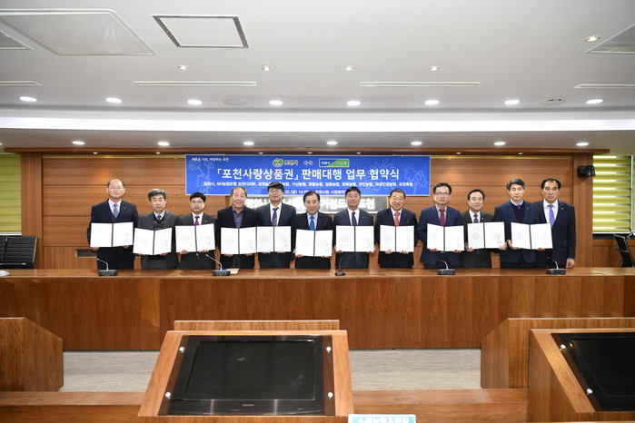 | ▲ 포천사랑상품권 판매대행 업무 협약식에서 협약 체결 후 박윤국 시장(왼쪽 여섯 번째)과 지역 농협 관계자들의 기념촬영 모습. (사진제공=포천시청) |