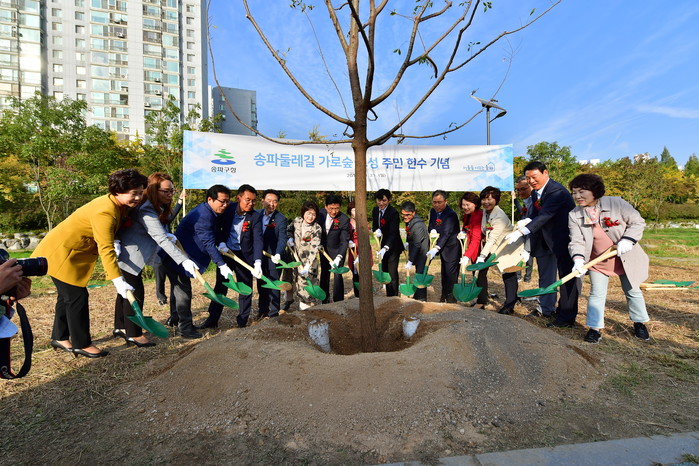 | ▲ '송파둘레길’ 주민 헌수식에 참석한 박성수 구청장과 내빈들이 삽으로 흙을 떠서 나무가 심겨진 구덩이에 던저 넣고 있다. (사진제공=송파구청) |