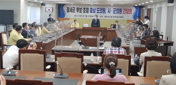더불어민주당의 대선 경선 후보인 정세균 전 총리가 27일 충남도의회를 방문해 도의원들과 시군의원들을 만나 지역 공약을 설명하고 있다.