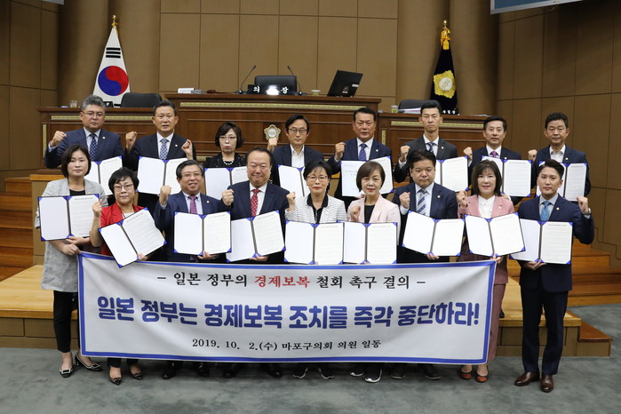 끝으로 의원들은 "일본 정부는 우호적 한일 관계를 악화시키고 자유무역주의에도 역행하는 경제 보복조치를 즉각 중단하고, 일본 정부와 전범기업은 일제강점기 강제징용 피해에 관한 우리 사법부의 판결을 존중하고, 강제징용 피해자들이 겪었던 역사적 고통에 대한 정당한 배상을 조속히 이행하라"면서 "마포구의회도 이번 사태가 해결될 때까지 일본 전범기업 제품의 불매운동에 앞장서 나갈 것"이라고 밝혔다.