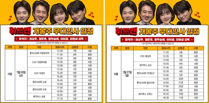 영화 ‘히트맨’ 측이오는 1/24일(금), 27일(월) 서울, 경기 지역의 극장 방문을 확정, 설 연휴인 개봉 주를 맞아 관객들과 특별한 만남을 예고했다. 이번 무대인사에는 ‘히트맨’의 주역 권상우, 정준호, 황우슬혜, 이이경 그리고 최원섭 감독이 참석할 예정이다.
