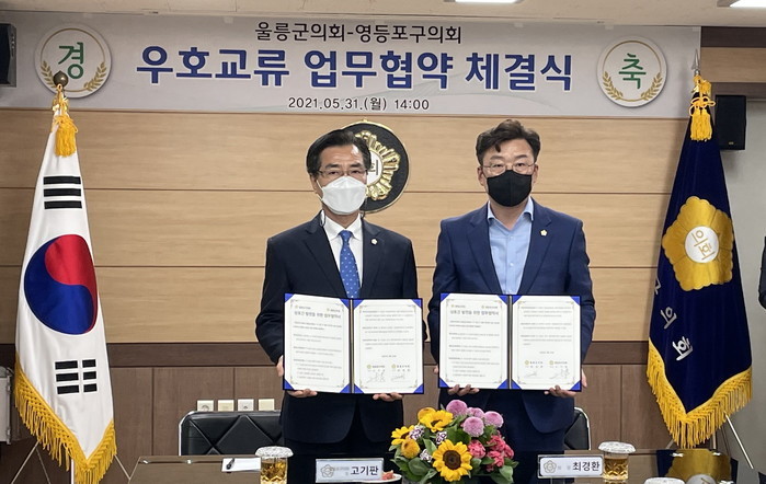 | ▲ 영등포구의회-울릉군의회 우호교류 업무협약 체결식에 참석한 고 의장(왼쪽)이 협약서를 들고 기념촬영을 하고 있다.(사진제공=영등포구의회) |