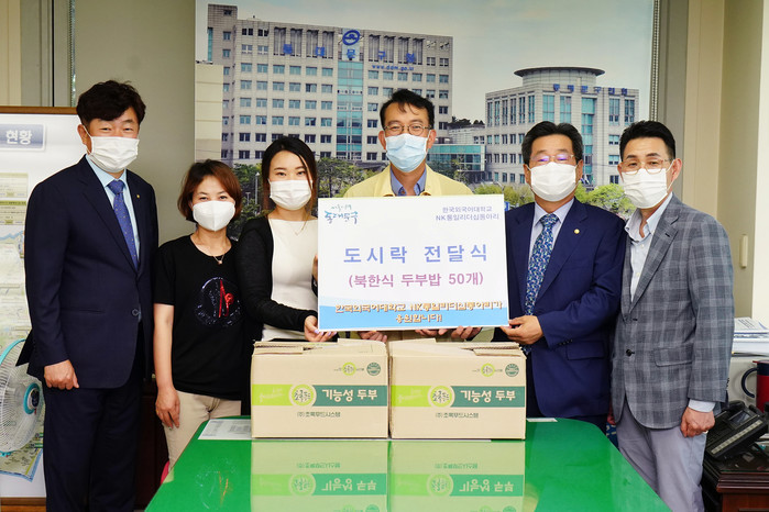 서울 동대문구는 최근 한국외국어대학교 NK통일리더십동아리로부터 동대문구보건소 선별진료소 의료진들을 위해 정성을 담아 만든 북한식 두부밥을 전달 받았다. 사진은 동대문구 부구청장실에서 열린 전달식에서 관계자들이 기념촬영을 하고 있는 모습. (사진제공=동대문구청)