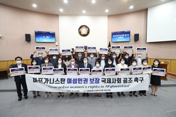 | ▲ 최근 열린 제284회 임시회 제1차 본회의에서 김일영 의장(앞줄 왼쪽 여섯 번째)과 의원들이 아프가니스탄 여성 및 아동의 처우를 위해 인권 관련 국제기구들과 공조해 나갈 것을 촉구하고 있다. (사진제공=성북구의회) |