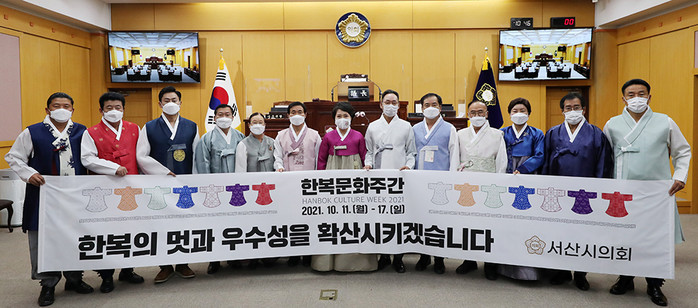 최근 열린 서산시의회 제266회 임시회에 참석한 의원들이 ‘2021 한복문화주간’을 맞아 한복을 입고 참석해 눈길을 끌었다. 사진은 한복을 입고 한복문화주간 플래카드를 들고 있는 의원들의 모습. (사진제공=서산시의회)