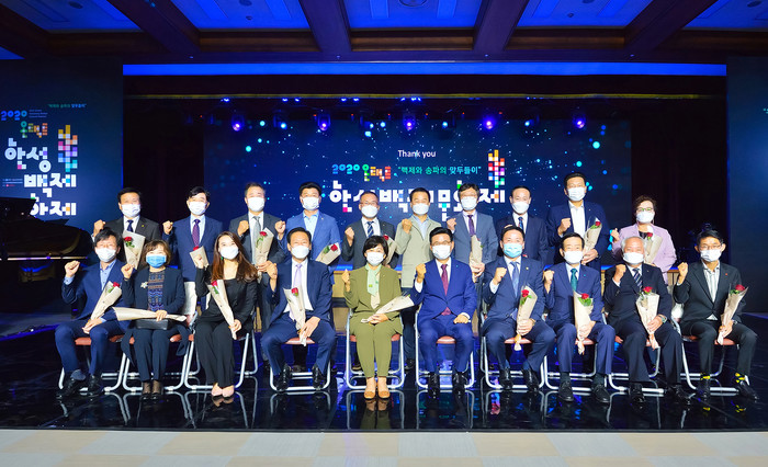 | ▲ ‘2020 온택트 한성백제문화제 개막식’에 참석한 이황수 의장이 행사 참석자들과 기념촬영을 하고 있다. (사진제공=송파구의회) |