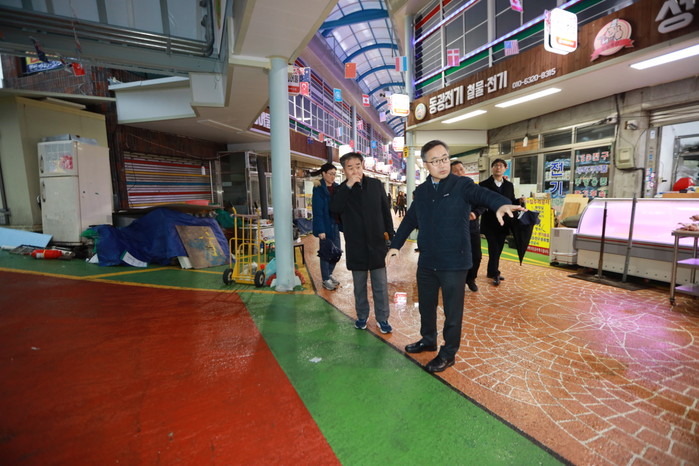 유성훈 금천구청장이 새해를 맞아 ‘2020년 안전중심의 건축행정 구현’을 위한 첫행보로 7일 '리모델링 및 신축 건축물 안전점검'을 실시했다. 사진은 유 구청장이 시흥5동 은행나무시장을 방문해 아케이드 시설물을 점검하고 있는 모습. (사진제공=금천구청)