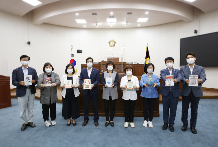 | ▲ 하남시의원들이 ‘안전한 휴가’ 보내기 일환으로 집에서 책 읽는 ‘북(BOOK)적 북(BOOK)적’ 프로젝트를 위한 여름 휴가철 추천도서 9선을 선정했다. 사진은 자신이 추천한 책들을 들고 있는 하남시의원들의 모습. (사진제공=하남시의회) |