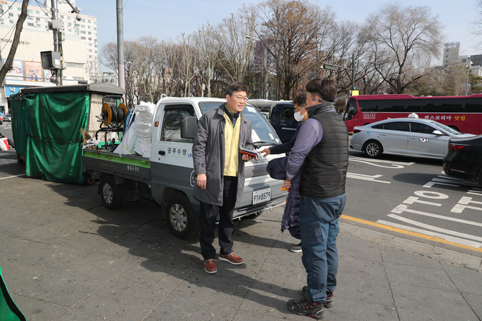 | ▲ 환경미화원들의 근무 지역을 방문한 전영준 의원(왼쪽)이 관계자들과 이야기를 나누며 애로사항을 듣고 있다. (사진제공=종로구의회) |